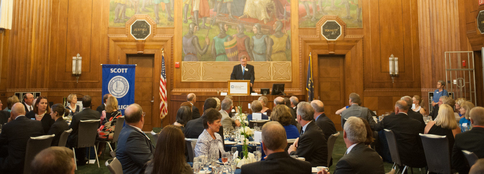 One of Indiana State’s most iconic spaces, the Kenneth L. Smith and Theresa Kathryn (Klein) Smith Magna Carta Courtroom has been painstakingly preserved to allow its rich history to become the ideal backdrop for your next meeting or event. Located in the newly renovated Federal Hall (Scott’s College of Business), the Kenneth L. Smith and Theresa Kathryn (Klein) Smith Magna Carta Courtroom once housed the U.S. Federal Court. The room’s mural depicting the 1215 signing of the Magna Carta was painted in 1935, but glistens as if it were painted just yesterday.